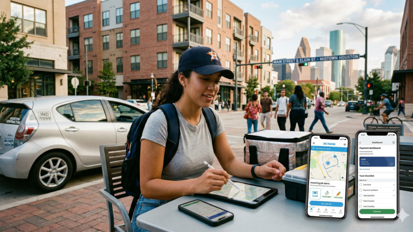 Favor Delivery: el gigante texano Si vives en Texas y no conoces Favor, de verdad te estás perdiendo una gran porción del pastel. Es una empresa nacida aquí (propiedad de H-E-B) y su penetración en Houston es masiva. Eres un “Runner”. A diferencia de otras apps donde solo recoges un paquete cerrado, en Favor a veces actúas casi como un asistente personal. Alguien puede pedirte unos tacos de un food truck en Westheimer que no tiene sistema online, o medicinas de una farmacia abierta a las 2 de la mañana.